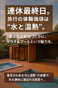 連休最終日。 旅行の体験価値は“水と温熱”。 選ばれる施設づくりに、サウナ&プールという魅力を。